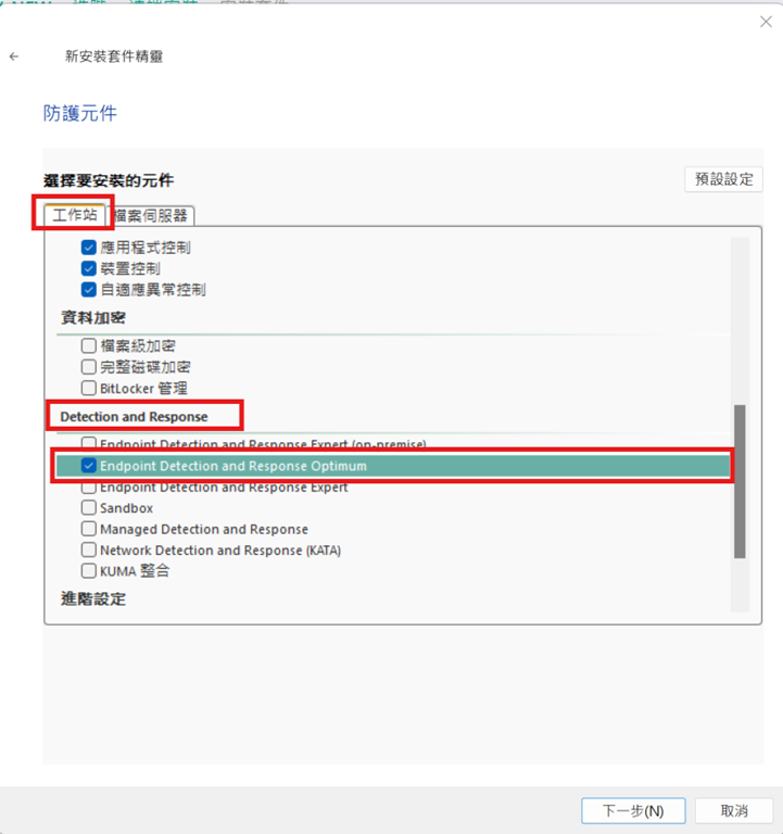 在安裝套件防護元件針對工作站請移至下方勾選「Endpoint Detection and Response Optimum」