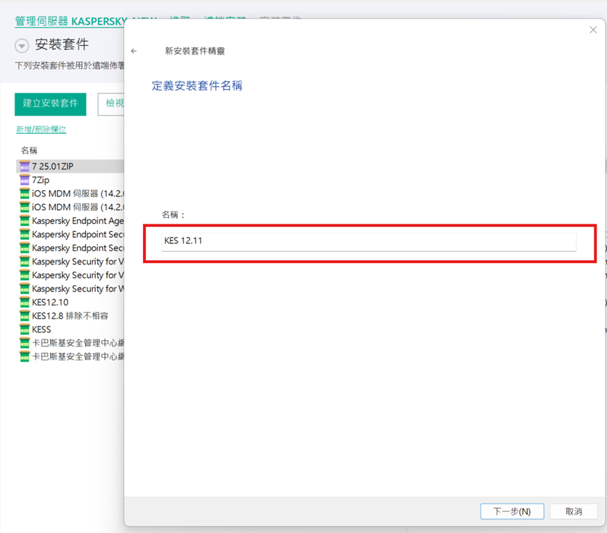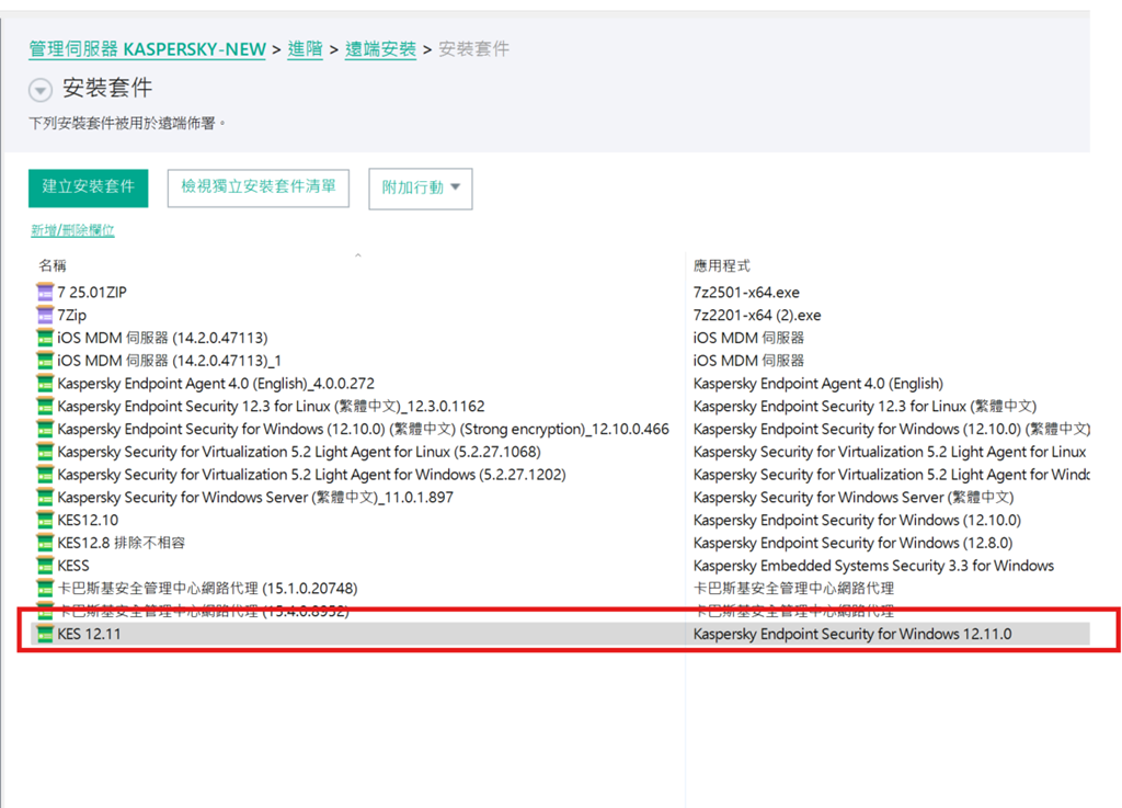安裝套件清單中則會出現「 Kaspersky Endpoint Security 12.11」的安裝套件