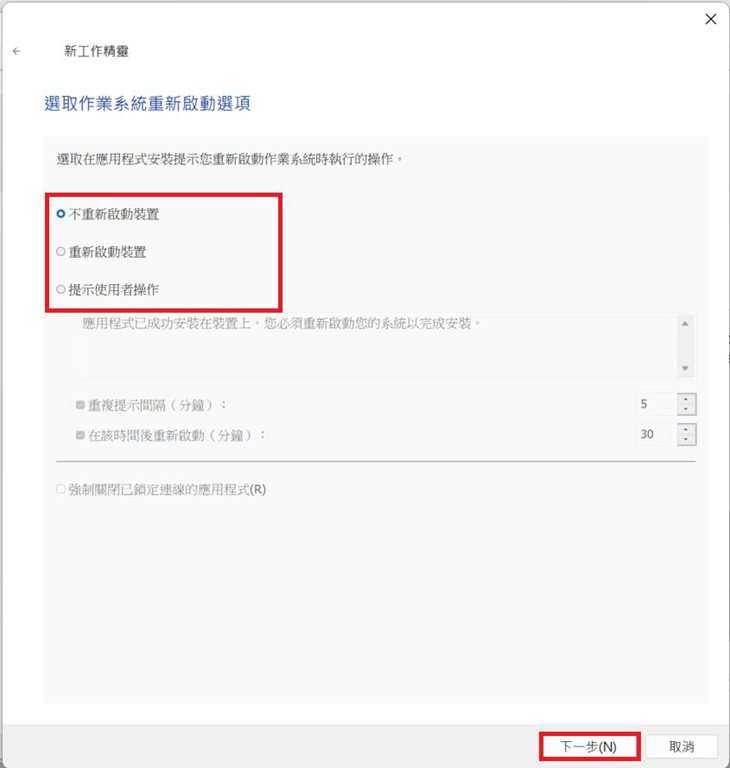 此步驟選擇「不重新啟動裝置」,點選「下一步」。
