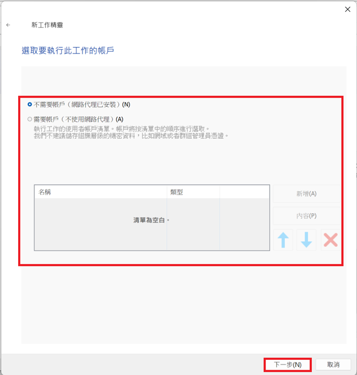 裝置已有安裝網路代理,則可以選擇「不需要帳戶」。設定完成後點選「下一步」。