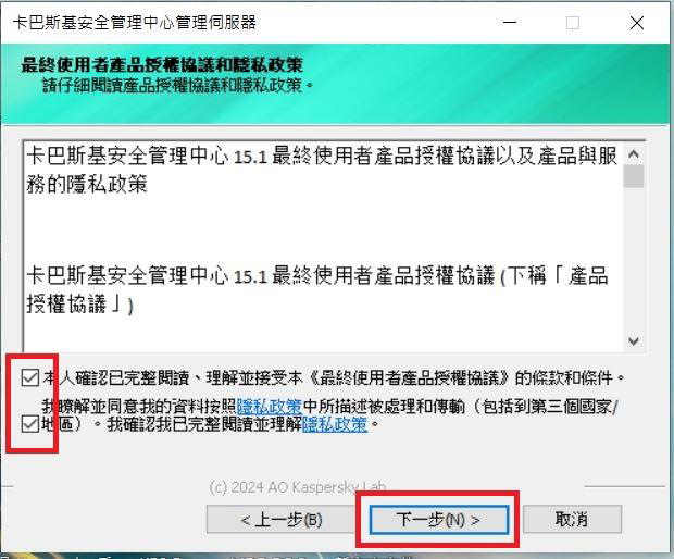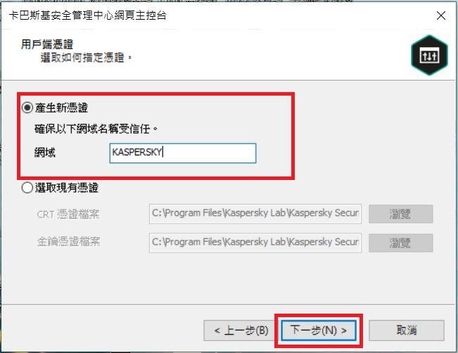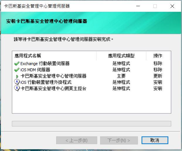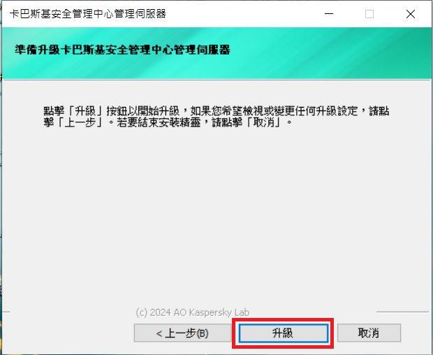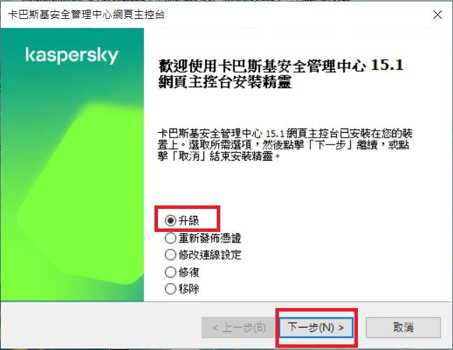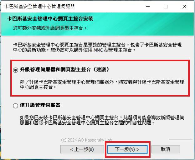 Step5.可選擇安裝「卡巴斯基安全管理伺服器和網頁主控台」或是「僅升級巴斯基安全管理伺服器」,完成後點選「下一步」。