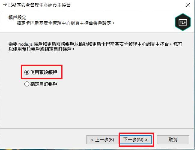 Step13.選擇「使用預設帳號」進行後續啟動,如果要指定特定帳號可以進行「指定自訂帳號」,選擇完成後點選「下一步」。