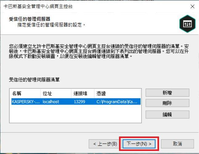 Step15.在受信任的管理伺服器清單中會看到管理伺服器清單,如要再網頁主控台再管理其它管理伺服器,也可以點選「新增」管理伺服器,確認後可點選「下一步」。
