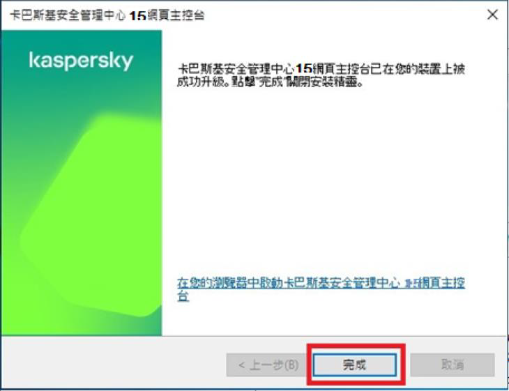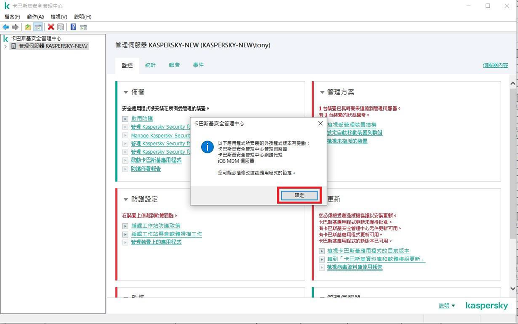 啟動後即可正常開啟KSC 15卡巴管理主控台和KSC 15網頁主控台。