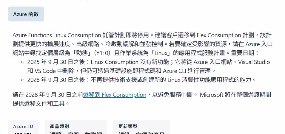 微軟官方有發送公告Azure Functions Linux Consumption 託管計劃即將停用。 https://azure.microsoft.com/zh-tw/updates/?id=4...