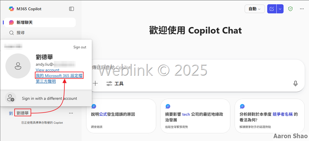 5. 點選左下角「帳號名稱」,接著點選「我的 Microsoft 365 設定檔」。