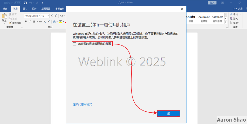 17. 取消勾選「允許我的組織管理我的裝置」,接著點選「是」。