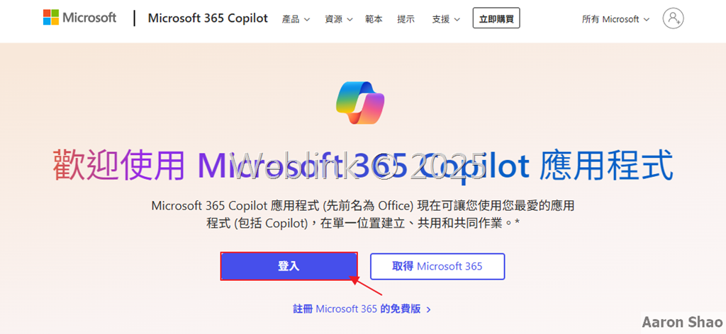 1. 開啟網頁「https://www.office.com/」,點選「登入」